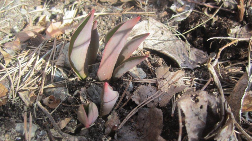 Idag oppdaget jeg de første tulipanspirene i østveggen. Rett ved siden av lå en halvspist tulipanløk. Jeg mener man kan se merkene etter rådyr-tanngarden. Så i ettermiddag måtte jeg til den forbaskede Plantasjen og skaffe sekkestrie og dekke-duk til blomsterbedene.
